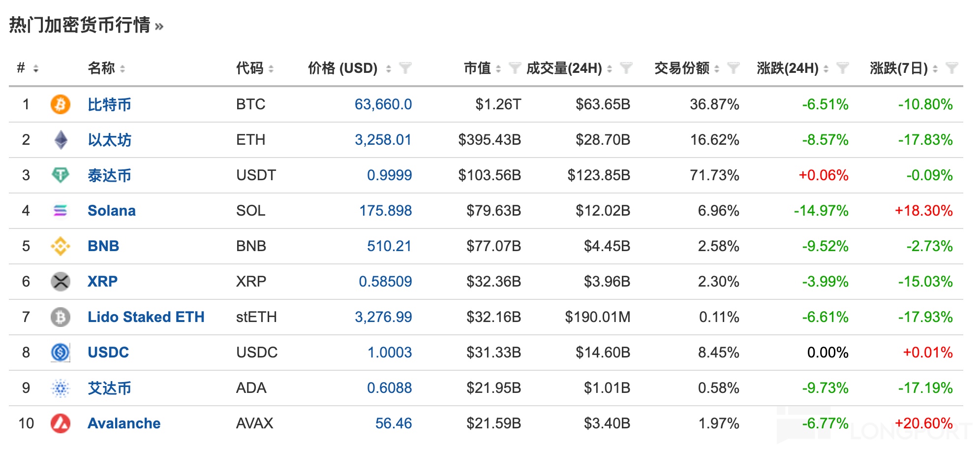 比特幣現報 63660 美元,24 小時跌超 6%;以太坊現報 3258 美元,24 小時跌超 8%。