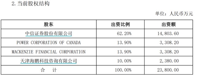 2022 年 6 月公告中顯示,當時的股權結構中,除了天津海鵬持有的股權,中信證券持有華夏基金 62.2% 的股權,POWER CORPORATION OF CANADA 和 MACKENZIE FINANCIAL CORPORATION 分別持有 13.9% 的股權。