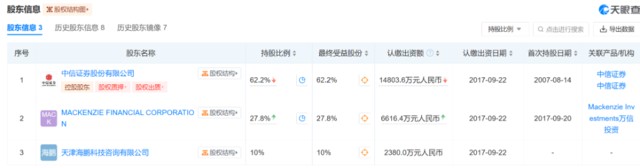 這之後,華夏基金股權結構顯示,除了天津海鵬持有的股權,中信證券持有華夏基金 62.2% 的股權, MACKENZIE FINANCIAL CORPORATION 持有 27.8% 的股權。