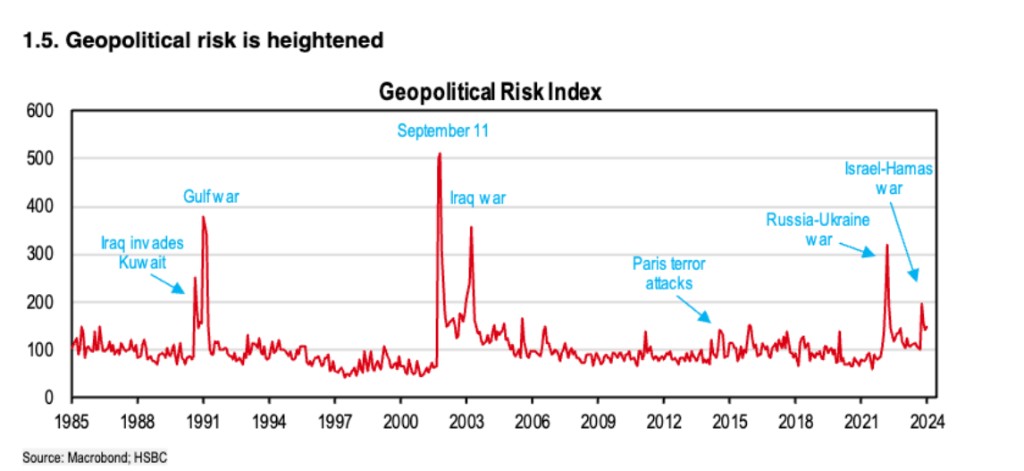 除了氣候變化和能源轉型,滙豐強調 2024 年地緣政治風險很高,2024 年即將到來的大量選舉,特別是美國大選,導致大宗商品存在供應中斷的風險: