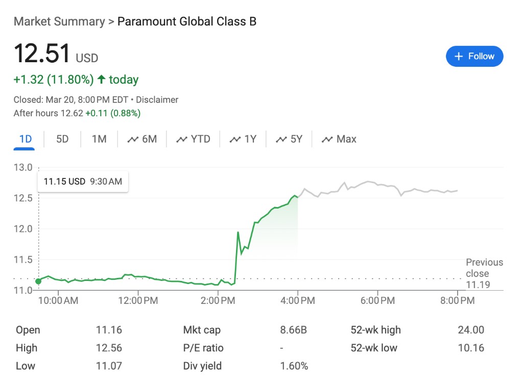 派拉蒙股價週三大漲 11.8%。據媒體報道,私募巨頭 Apollo 出價 110 億美元,收購這家媒體公司的電影製片廠。