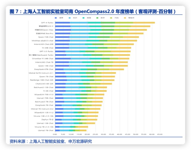 但同時根據評測,複雜推理相關能力是大模型普遍面臨的難題,國內大模型相比於 GPT-4 還存在差距。評測顯示,推理、數學、代碼、智能體是國內大模型的短板。GPT-4Turbo 在涉及複雜推理的場景雖然亦有提升空間,但已明顯領先於國內的商業模型和開源模型。這是大模型在金融、工業等要求可靠的場景落地需要的關鍵能力。