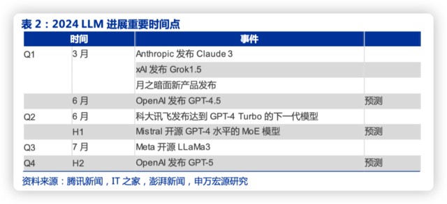 1)市場可能認為海外大模型迭代放緩,但我們認為 2024 年模型能力仍然快速迭代。包括 OpenAI 以外的其他模型能力追趕、Llama3 等開源大模型發佈、下半年 OpenAI 的新模型迭代等;