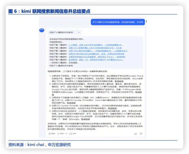 3)能夠針對提問自動聯網搜索總結回答,答案提供信息來源,更具可靠性。例如下圖問 kimi 關於谷歌 2024 的最新新聞,基本涵蓋了所有要點新聞,總結也到位。