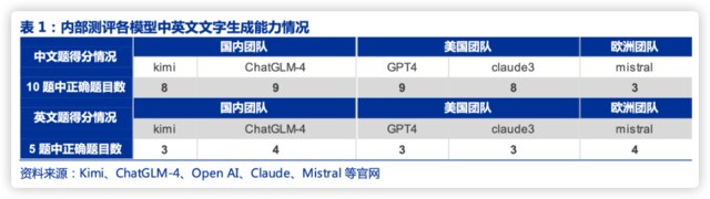 根據我們內部測評,國產大模型 Kimi 文字能力全面達到 GPT-4 水平。Kimi 中英文生成能力已經接近 GPT-4 水平,儘管邏輯推理能力仍有差距,且主打文字生成、目前無多模態能力;Cluade3 中英文生成、理解、推理,多模態圖片理解能力均與 GPT-4 接近,效果好於 Gemini,且實際使用中生成速度快於 GPT-4 和 Gemini。