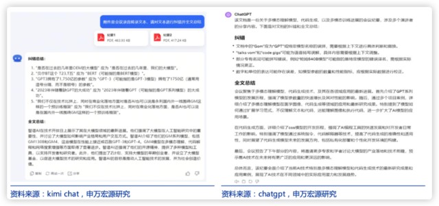 2)資料整理總結方面 kimi 在會議紀要總結能力上具有優勢,選取一場會議的錄音轉錄文本(分成兩份 pdf)給到模型進行文本糾錯和全文總結,kimi 的糾錯能力和總結能力強於 GPT4,例如 kimi 能根據上下文將 “貝爾 BT 這個 T23,T 五” 這個亂碼糾正為 “BERT”,並告知可能指 BERT 模型,其全文總結結果也比 GPT4 結果更具可用性。