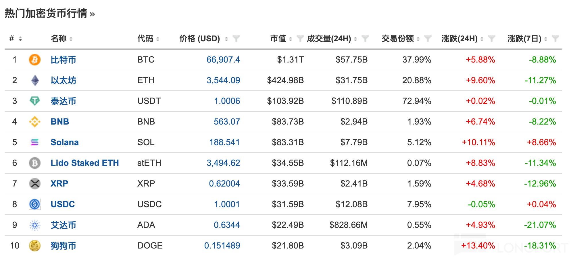 比特币现报 66907 美元,24 小时涨近 6%;以太坊现报 3544 美元,24 小时涨近 10%。