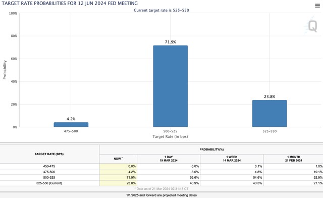 美联储公布的最新点阵图显示,政策制定者预计今年年底前将降息三次,表明比市场更鸽派。市场预计在 6 月至少会降息 25 个基点的可能性约为 76%,在 7 月或之前降息的可能性接近 90%。美联储似乎按计划行事,标普 500 指数今年已涨近 10%。投资者对美联储的看法波动过大,从最初预期 2024 年有六次降息,到现在开始质疑是否会在夏季降息。市场对鸽派立场持乐观态度,预计标普 500 指数到年底可能涨至 5800-6000 点区间。
