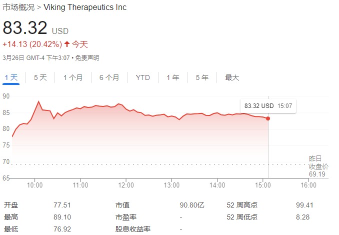 3 月 27 日隔夜,減肥藥概念股、生物科技公司 Viking Therapeutics 盤中一度上漲將近 28.8%,創 2 月 27 日以來最大盤中漲幅。自今年年初以來,Viking 股價已經漲了 342%,使公司的市值增加到 88 億美元左右。