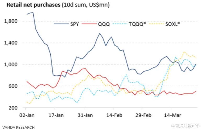 然而,他們指出,最近幾周個人投資者使用槓桿的情況 “明顯增加”。自年初以來散户資金流入四個被購買最多的交易所交易基金為標普 500 指數 ETF(SPY.US)、納指 100 ETF(QQQ.US)、3 倍做多納指 ETF(TQQQ.US) 和 3 倍做多半導體 ETF(SOXL.US)。