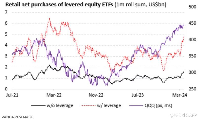 美國散户在報税季節購買股票減少,但對高槓杆交易所交易基金的興趣增加。散户資金流入四個最受歡迎的交易所交易基金,包括標普 500 指數 ETF、納指 100 ETF、3 倍做多納指 ETF 和 3 倍做多半導體 ETF。個人投資者使用槓桿的情況明顯增加,但這也使得他們更容易受到股票回調的影響。散户交易活動可能會在 5 月初開始增加。