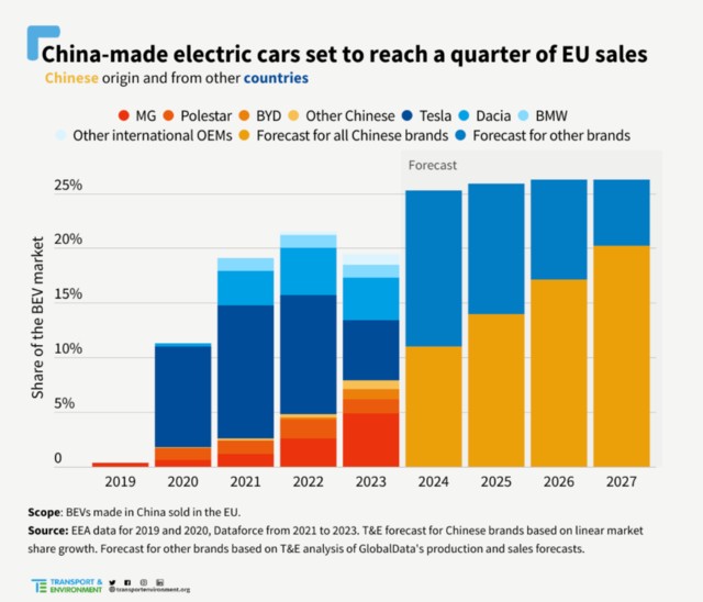 據歐洲運輸與環境組織 (Transport & Environment) 的分析,中國製造的電動汽車在 2024 年將佔據歐洲市場份額的 25%。
