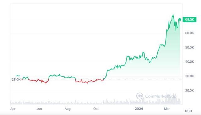 CoinMarketCap 數據顯示,到往常美股收盤時,比特幣(BTC)現貨交易價處於 6.96 萬美元上方,最近 24 小時跌超 1%,最近七日漲超 9%,3 月漲超 12%,今年初以來的一季度內累漲超 60%。