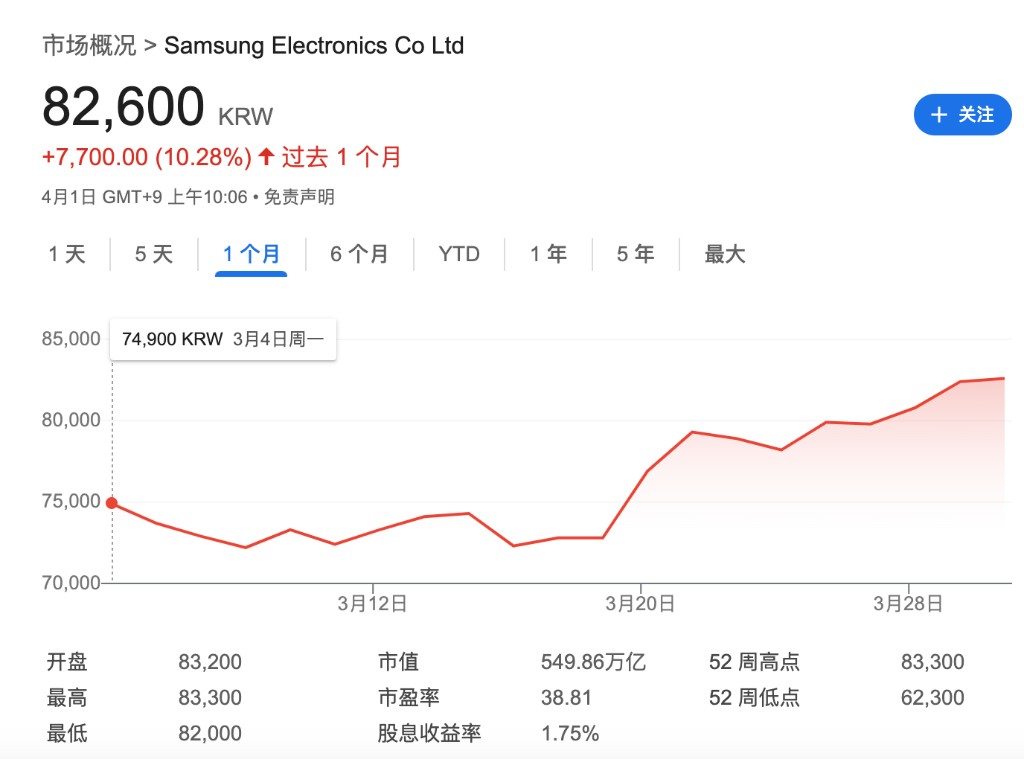 三星電子今年以來股價上漲 3.77%,不過其最近一個月上漲了 10.28%。