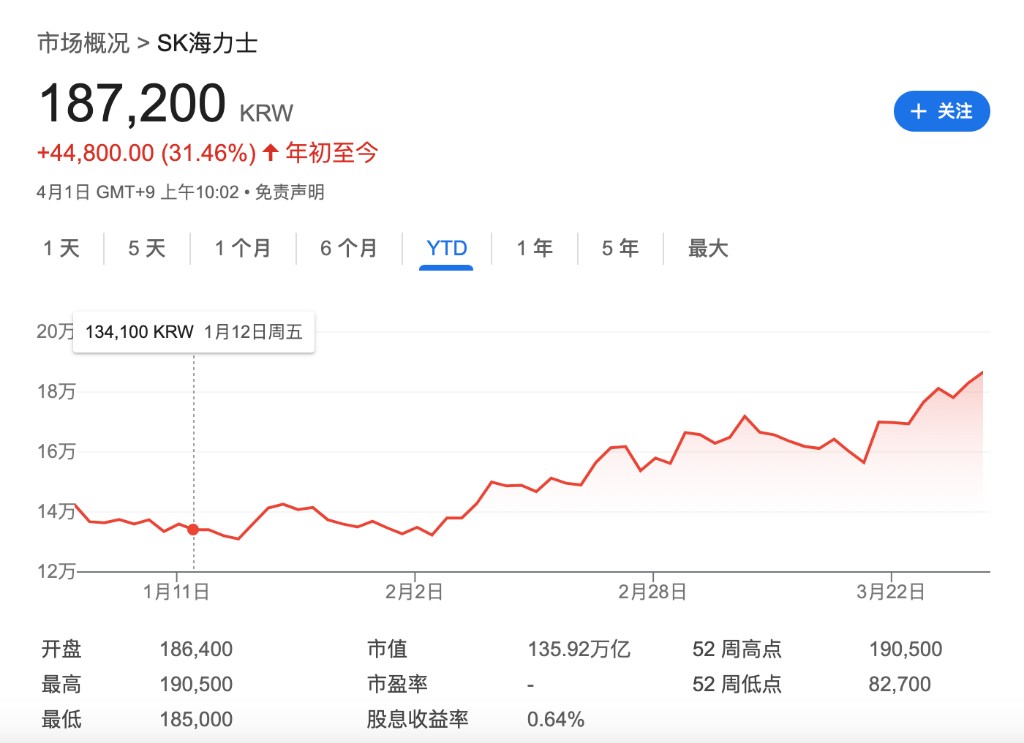 SK 海力士今年以來股價已上漲 31.46%,4 月 1 日,其上漲 4.1%,市值突破 1000 億美元。