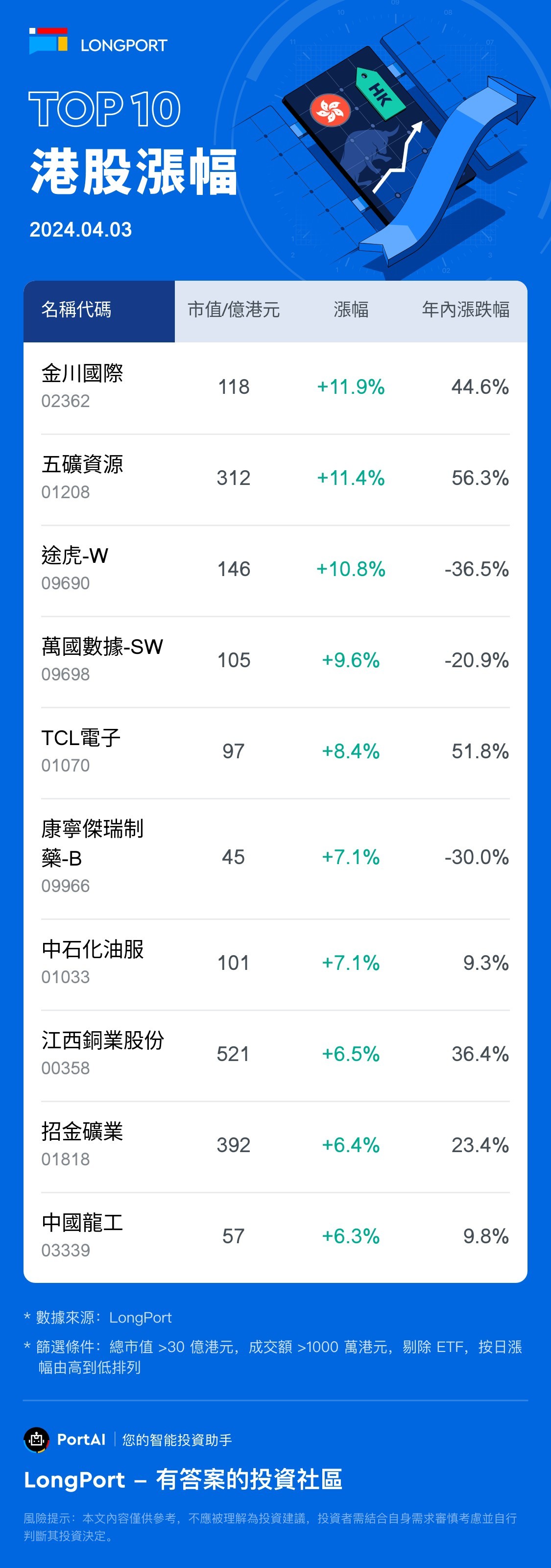 金川國際 (02362) 涨 11.9%,成交额 7702.6 万港元,年内累计涨 44.6%。 五礦資源 (01208) 涨 11.42%,成交额 3.1 亿港元,年内累计涨 56.3%。 途虎-W(09690) 涨 10.81%,成交额 1.5 亿港元,年内累计跌 36.5%。