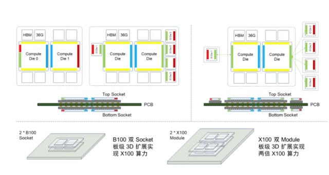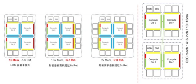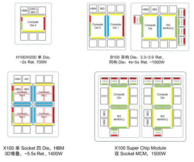 3. 如果 X100 采用单 Socket 封装,四个异构 Die 合封装的方式,需要在计算 Die 上堆叠 HBM,同时需要先进封装的基板达到 6 倍 Reticle 面积。但是,如果采用 SuperChip 超级芯片的方式组成双 Socket 封装模组,可以避免计算 Die 上堆叠 HBM,并放松对先进封装基板面积的要求,此时需要对 NVLink C2C 的驱动能力做增强。