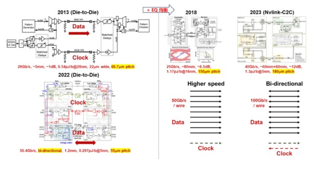 基于 NVLink C2C 的产品目前只有 GH200 这一代,但是从 Nvidia 在该领域公开发表的论文中可以大致看出其技术发展的脉络。从技术演进上看,它是封装内 Die 间互联的在均衡上的增强。从 Nvidia SuperChip 超级芯片路标来看,它将在未来的 AI 芯片中继续发挥重要作用。对于这类接口,仍需保持连接两个独立封装芯片的能力和极低的时延和功耗。当前的 NVLink C2C 采用 9*40Gbps NRZ 调制方式。未来 NVLink-C2C 可能会向更高速率和双向传输技术方向演进。而 50G NRZ 是 C2C 互联场景下在功耗和时延方面的设计甜点。继续维持 NRZ 调制,选择合适工作频率,走向双向传输将是实现速率翻倍的重要技术手段。虽然 NVLink C2C 针对芯片间互联做了优化设计,但由于它与标准 SerDes 之间不存在速率对应关系,无法实现与标准 SerDes 之间比特透明的信号转换,因此其应用场景受限。在与标准 SerDes 对接时需要多引入一层协议转化会增加时延、面积和功耗开销。未来可能存在一种可能性,即采用类似 NVLink C2C 这种高密单端传输技术,同时与标准 SerDes 实现多对一的速率匹配,这种技术一旦实现将极大地扩展 C2C 高密单端互联技术的应用空间,也有可能开启 SerDes 面向更高速率演进的新赛道。