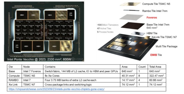 Intel Ponte Vecchio GPU 将 Chiplet 和先进封装技术推向了极致,它涉及 5 个工艺节点(包括 TSMC 和 Intel 两家厂商的不同工艺),47 个有源的 Tile,并同时采用了 EMIB 2.5D 和 Foveros 3D 封装技术。可以说,它更像是一个先进封装技术的试验场。Intel 的主力 AI 芯片是 Gaudi 系列 AI 加速芯片 [27][28][29]。值得注意的是 Gaudi 系列 AI 芯片是由 TSMC 代工的 Gaudi 2 采用的是 TSMC 7nm 工艺,Gaudi 3 采用的是 TSMC 5nm 工艺。