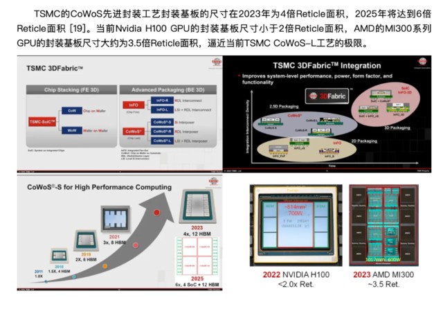 TSMC 的 CoWoS 先进封装工艺封装基板的尺寸在 2023 年为 4 倍 Reticle 面积,2025 年将达到 6 倍 Reticle 面积 [19]。当前 Nvidia H100 GPU 的封装基板尺寸小于 2 倍 Reticle 面积,AMD 的 MI300 系列 GPU 的封装基板尺寸大约为 3.5 倍 Reticle 面积,逼近当前 TSMC CoWoS-L 工艺的极限。