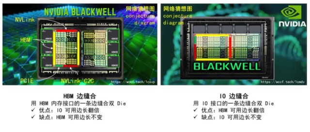 以 H100 GPU 芯片布局为基础,通过先进的封装技术将两颗类似 H100 大小的裸 Die 进行合封,可以推演 B100 GPU 架构。B100 GPU 有两种 “双 Die” 推演架构:IO 边缝合和 HBM 边缝合 [31][32]。“HBM 边缝合” 利用 H100 的 HBM 边进行双 Die 连接,这种方案的优点在于,它可以使得 IO 可用边长翻倍,从而有利于扩展 IO 带宽。然而,它的缺点在于 HBM 可用边长并没有改变,因此无法进一步扩展 HBM 容量。“IO 边缝合” 利用 H100 的 IO 边进行双 Die 连接,这种方案的优势在于 HBM 可用边长能够翻倍,从而有利于扩展内存。然而,它的缺点在于 IO 可用边长并未改变,因此需要进一步提升 IO 密度。考虑到每代芯片与上一代相比,在内存、算力、互联三个层面需要实现两倍以上的性能提升,采用 “IO 边缝合” 方案的可能性更大。采用 “IO 边缝合” 的方案需要提升 IO 的边密度。