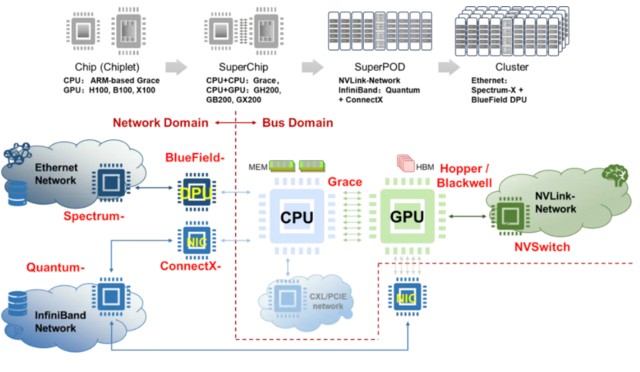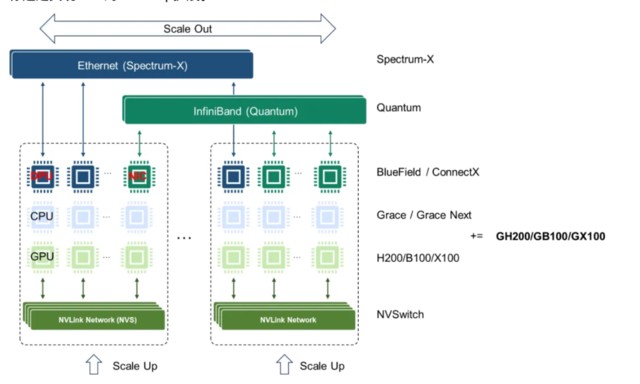 Nvidia 将延用 SuperChip 超级芯片架构,NVLink-C2C 和 NVLink 互联技术在 Nvidia 未来的 AI 芯片架构中将持续发挥关键作用。其利用 NVLink-C2C 互联技术构建 GH200、GB200 和 GX200 超级芯片。更进一步,通过 NVLink 互联技术,两颗 GH200、GB200 和 GX200 可以背靠背连接,形成 GH200NVL、GB200NVL 和 GX200NVL 模组。Nvidia 可以通过 NVLink 网络组成超节点,通过 InfiniBand 或 Ethernet 网络组成更大规模的 AI 集群。