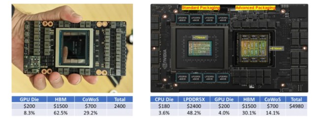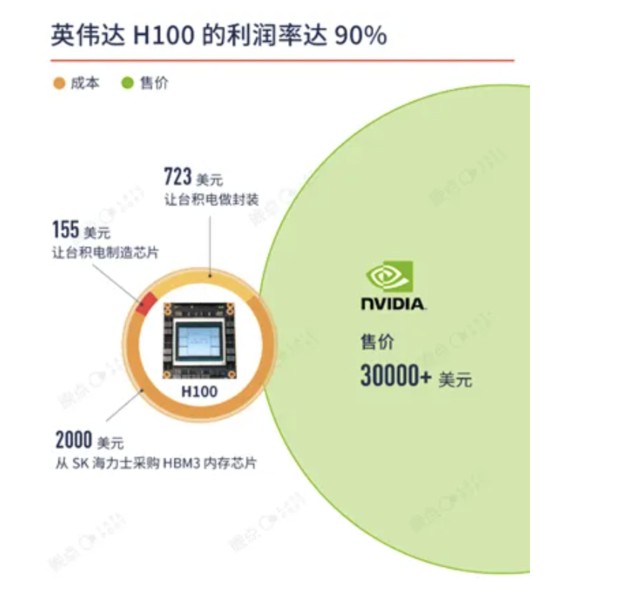 有媒体测算 Nvidia 的 H100 利润率达到 90%。同时也给出了估算的 H100 的成本构成,Nvidia 向台积电下订单,用 N4 工艺制造 GPU 芯片,平均每颗成本 155 美元。Nvidia 从 SK 海力士(未来可能有三星、美光)采购六颗 HBM3 芯片,成本大概 2000 美元。台积电生产出来的 GPU 和 Nvidia 采购的 HBM3 芯片,一起送到台积电 CoWoS 封装产线,以性能折损最小的方式加工成 H100,成本大约 723 美元 [24]。