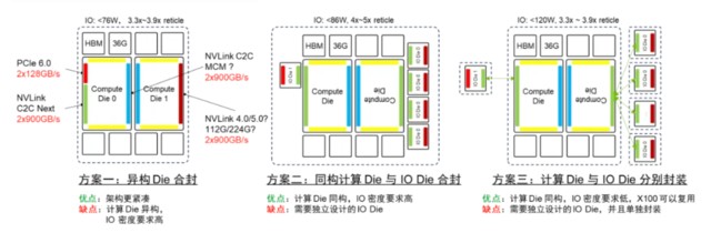 Nvidia B100 有 “异构 Die 合封”,“计算 Die 与 IO Die 分离,同构计算 Die 与 IO Die 合封”,“计算 Die 与 IO Die 分离并分别封装,并用 C2C 互联将二者连接” 三种架构选项。Nvidia B100 如果采用单封装双 Die 架构,封装基板面积达到 3.3~3.9 倍 Reticle 面积,功耗可能超过 1kW。计算 Die 之间互联可以复用 NVLink C2C 互联技术。将计算 Die 和 IO Die 分离可以实现计算 Die 的同构化,降低成本。利用 NVLink C2C 出封装互联的能力,可以将 IO 扇出,降低 IO 边密度压力。需要注意的是,当前 NVLink C2C 速率与 PCIE & NVLink 的 SerDes 无法匹配,因此需要 IO Die 上作协议转换,无法做到协议无关。如果 C2C 互联和 SerDes 速率能够进行多对一的匹配实现比特透明的 CDR,这样可以消除协议转换的开销。考虑到 B100 2024 年推出的节奏,方案一、三匹配当前先进封装能力,但方案三需要引入额外的协议转换;方案二超出当前先进封装能力。