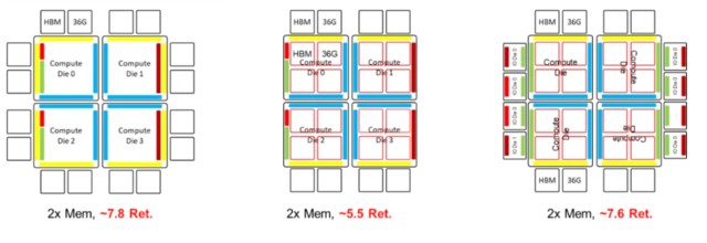 为了实现计算 Die 的归一化,可以将 IO 从计算 Die 中分离出来,形成独立的 IO Die。这样,计算 Die 的互联接口就实现了归一化,使计算 Die 具备了旋转对称性。在这种情况下,仍然存在两种架构:一种是同构计算 Die 与 IO Die 合封,另一种是计算 Die 与 IO Die 分别封装并用 C2C 互联将二者连接。计算 Die 的同构最大的优势在于可以实现芯片的系列化。通过灵活组合计算 Die 和 IO Die,可以实现不同规格的芯片以适应不同的应用场景的需求。