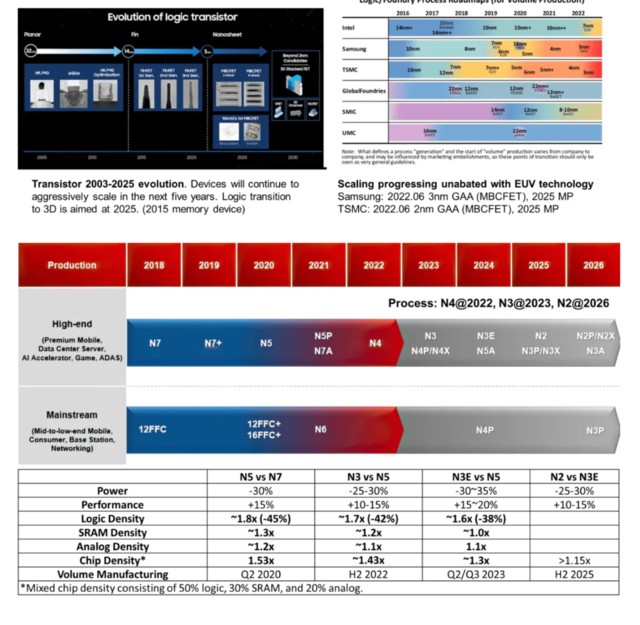 按照 TSMC 给出的工艺演进路标,2023~2025 年基本以 3nm 工艺为主,2nm 工艺在 2025 年以后才会发布。3nm 技术已经进入量产阶段,N3 工艺和 N3E 版本已经于 2023 年推出。2024 年下半年开始生产 N3P 版本,该版本将提供比 N3E 更高的速度、更低的功耗和更高的芯片密度。此外,N3X 版本将专注于高性能计算应用,提供更高的时钟频率和性能,预计将于 2025 年开始量产 [18]。工艺演进的收益对于逻辑器件的收益小于 50%,因此,未来单芯片算力提升将更依赖于先进封装技术。