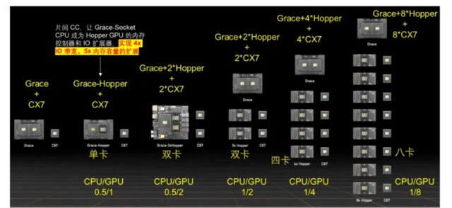 NVLink 和 NVLink C2C 技术提供了更灵活设计,实现了 CPU 和 GPU 灵活配置,可以构建满足不同应用需求的系统架构。NVLink C2C 可以提供灵活的 CPU、GPU 算力配比,可组成 1/0,0.5/1,0.5/2,1/4,1/8 等多种组合的硬件系统。NVLink C2C 支持 Grace CPU 和 Hopper GPU 芯片间内存一致性操作 (Cache-Coherency),让 Grace CPU 成为 Hopper GPU 的内存控制器和 IO 扩展器,实现了 4 倍 IO 带宽和 5 倍内存容量的扩展。这种架构打破了 HBM 的瓶颈,实现了内存超发。对训练影响是可以缓存更大模型,利用 ZeRO 等技术外存缓存模型,带宽提升能减少 Fetch Weight 的 IO 开销。对推理影响是可以缓存更大模型,按需加载模型切片推理,有可能在单 CPU-GPU 超级芯片内完成大模型推理 [23]。