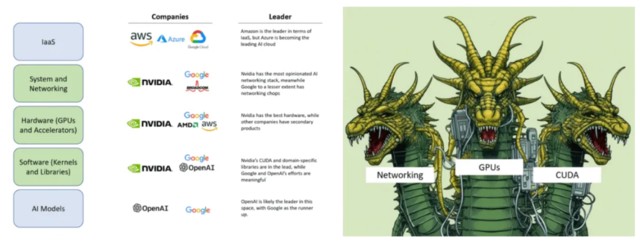 从业务视角看,Nvidia 在系统和网络、硬件、软件三个方面占据了主导地位 [6]。系统和网络、硬件、软件这三个方面是人工智能价值链中许多大型参与者无法有效或快速复制的重要部分,这意味着 Nvidia 在整个生态系统中占据着主导地位。要击败 Nvidia 就像攻击一个多头蛇怪。必须同时切断所有三个头才有可能有机会,因为它的每个 “头” 都已经是各自领域的领导者,并且 Nvidia 正在努力改进和扩大其护城河。在一批人工智能硬件挑战者的失败中,可以看到,他们都提供了一种与 Nvidia GPU 相当或略好的硬件,但未能提供支持该硬件的软件生态和解决可扩展问题的方案。而 Nvidia 成功地做到了这一切,并成功抵挡住了一次冲击。这就是为什么 Nvidia 的战略像是一个三头水蛇怪,后来者必须同时击败他们在系统和网络、硬件以及软件方面的技术和生态护城河。目前,进入 Nvidia 平台似乎能够占据先机。OpenAI、微软和 Nvidia 显然处于领先地位。尽管 Google 和 Amazon 也在努力建立自己的生态系统,但 Nvidia 提供了更完整的硬件、软件和系统解决方案,使其成为最具吸引力的选择。要赢得先机,就必须进入其硬件、软件和系统级业务生态。然而,这也意味着进一步被锁定,未来更难撼动其地位。从 Google 和 Amazon 等公司的角度来看,如果不选择接入 Nvidia 的生态系统,可能会失去先机;而如果选择接入,则可能意味着失去未来。