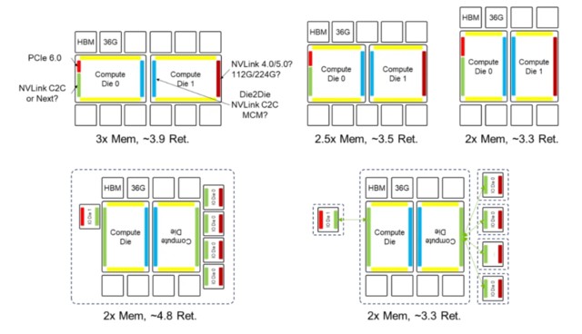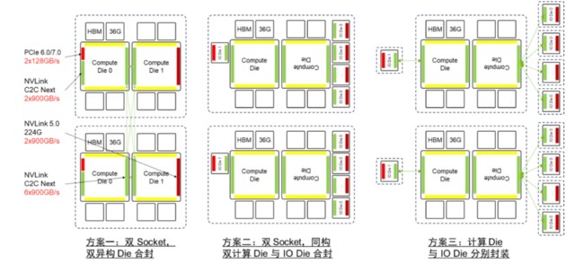在满足 2025 年的工程约束的前提下,X100 也可以采用 SuperChip 超级芯片架构在 B100 双 Die 架构的基础上进行平面扩展。在这种情况下,Nvidia X100 也有 “异构 Die 合封”,“同构计算 Die 与 IO Die 合封”,“计算 Die 与 IO Die 分别封装” 三种架构选项。如果采用封装间互联的超级芯片的扩展方式,先进封装的基板面积约束将不再会是瓶颈,此时只需要增强 NVLink C2C 的驱动能力。