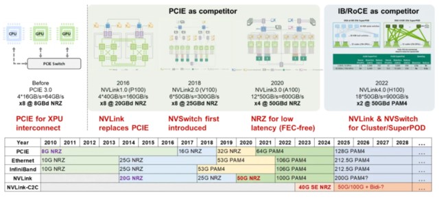 互联技术的演进是一个渐进的过程,其基本技术要素如带宽、调制和编码等都遵循着其内在的发展规律。这些物理规律相对稳定,通过将这些技术进行组合并结合当前工程工艺的发展趋势以及需求,就可以大致描绘和预测出互联技术的发展方向。在这里不深入探讨晦涩难懂的互联技术本身的发展,而是从宏观技术逻辑和外在可观察的指标两个角度出发,探讨 NVLink 和 NVLink C2C 的历史演进,并对其未来发展进行预测。