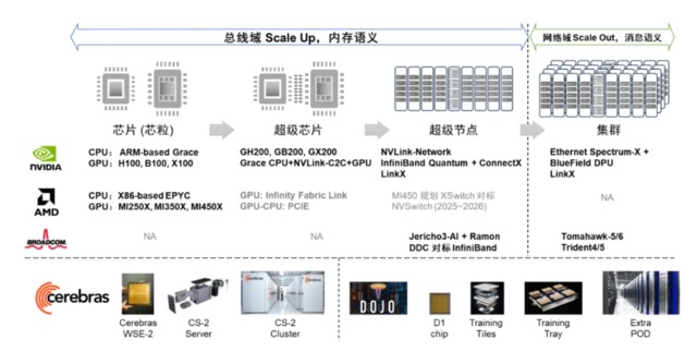 Nvidia 在 AI 集群竞争态势中展现出了全面布局,涵盖了计算(芯片、超级芯片)和网络(超节点、集群)领域。在计算芯片方面,Nvidia 拥有 CPU、GPU、CPU-CPU/CPU-GPU SuperChip 等全面的布局;在超节点网络层面,Nvidia 提供了 NVLink 和 InfiniBand 两种定制化网络选项;在集群网络方面,Nvidia 有基于 Ethernet 的交换芯片和 DPU 芯片布局。AMD 紧随其后,更专注于 CPU 和 GPU 计算芯片,并采用基于先进封装的 Chiplet 芯粒技术。与 Nvidia 不同的是,AMD 当前没有超级芯片的概念,而是采用了先进封装将 CPU 和 GPU Die 合封在一起。AMD 使用私有的 Infinity Fabric Link 内存一致接口进行 GPU、CPU、GPU 和 CPU 间的互联,而 GPU 和 CPU 之间的互联仍然保留传统的 PCIE 连接方式。此外,AMD 计划推出 XSwitch 交换芯片,下一代 MI450 加速器将利用新的互连结构,其目的显然是与 Nvidia 的 NVSwitch 竞争 [15]。BRCM 则专注于网络领域,在超节点网络有对标 InfiniBand 的 Jericho3-AI+Ramon 的 DDC 方案;在集群网络领域有基于 Ethernet 的 Tomahawk 系列和 Trident 系列交换芯片。近期 BRCM 推出其新的软件可编程交换 Trident 5-X12 集成了 NetGNT 神经网络引擎实时识别网络流量信息,并调用拥塞控制技术来避免网络性能下降,提高网络效率和性能 [16]。Cerebras/Telsa Dojo 则 “剑走偏锋”,走依赖 “晶圆级先进封装” 的深度定制硬件路线。