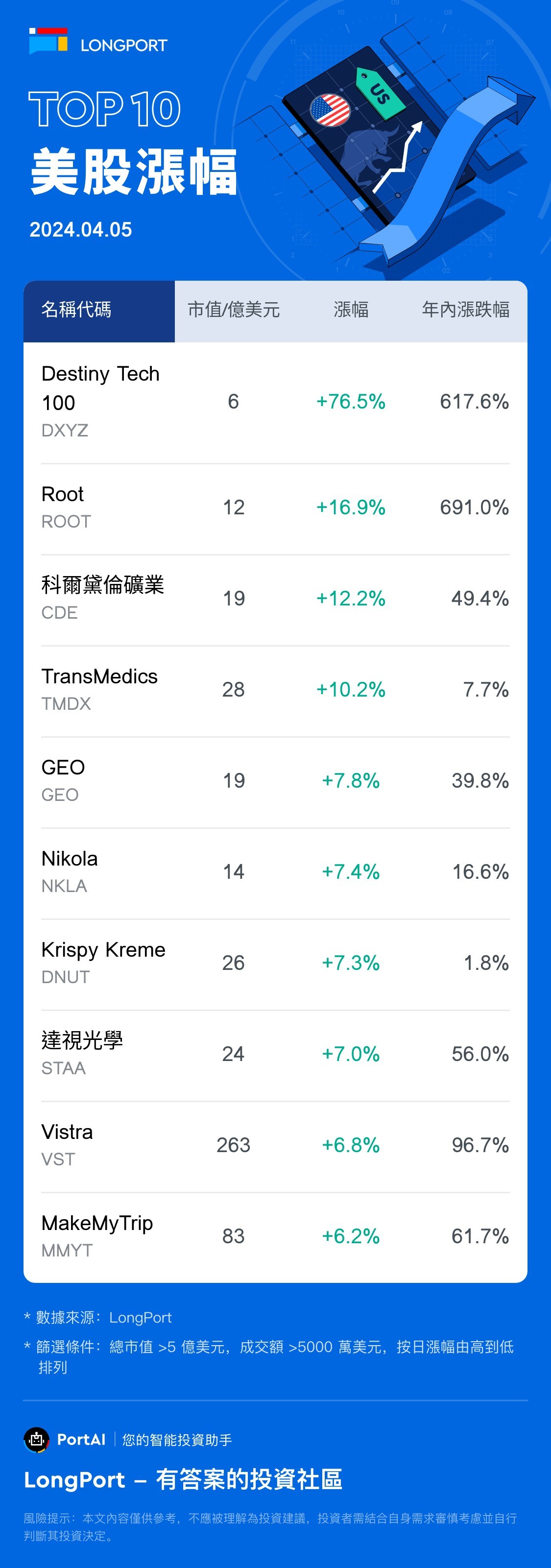 Destiny Tech100(DXYZ) 涨 76.51%,成交额 3.0 亿美元,年内累计涨 617.6%。 Root(ROOT) 涨 16.88%,成交额 8541.3 万美元,年内累计涨 691%。 科爾黛倫礦業 (CDE) 涨 12.21%,成交额 8434.0 万美元,年内累计涨 49.4%。