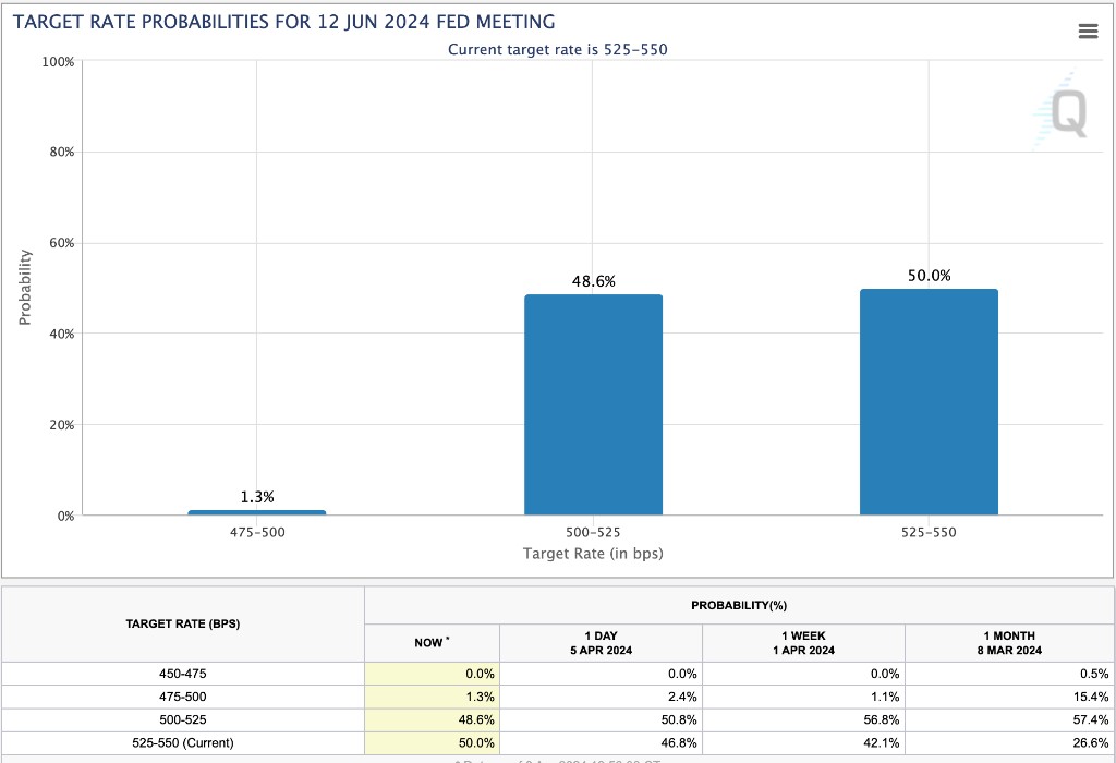 CME 美聯儲觀察工具顯示,市場對於美聯儲 6 月份首次降息的預期可能性已經從一週前的 55.2% 降至 50.8%。互換合約市場定價顯示交易員預計 9 月可能才首次降息。