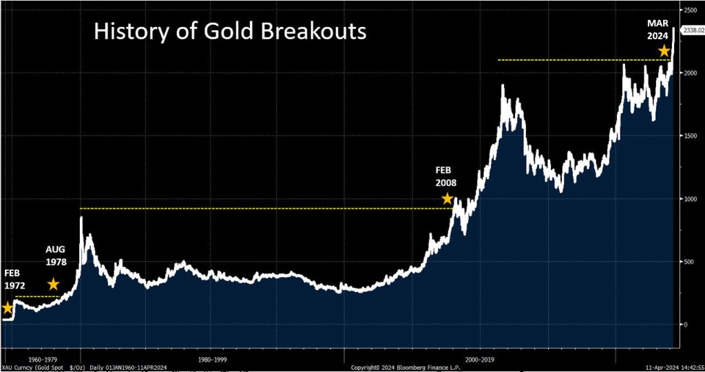 最近金價的飆升讓我聯想到一句名言:“幾十年什麼都沒有發生,然後是幾周內發生了幾十年的事。” 歷史數據表明,金價可能會長時間處於低迷狀態,但一旦突破,漲勢往往會迅猛而激烈。投資者在決定是否追漲或迴避最近的金價上漲時,可以參考過去的行情來獲得啓發。這裏我將 “突破” 定義為金價比之前歷史峯值高出 10%。