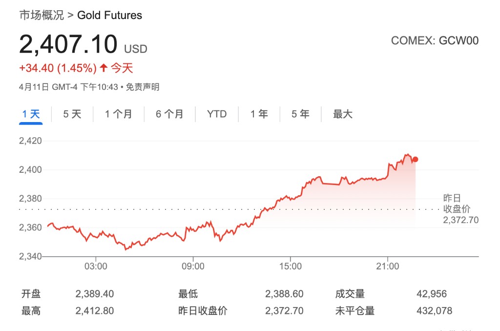 國際金價續創新高。4 月 12 日,國際金價再度上行,COMEX 黃金站上 2400 美元大關,最高達 2412.8 美元/盎司;倫敦現貨黃金則逼近 2400 美元大關,一度達 2395.34 美元/盎司,均創歷史新高。