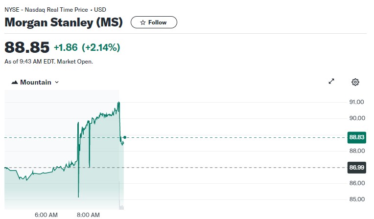 財報發佈後,摩根士丹利股價盤前一度漲至 4%,開盤後漲超 2%。