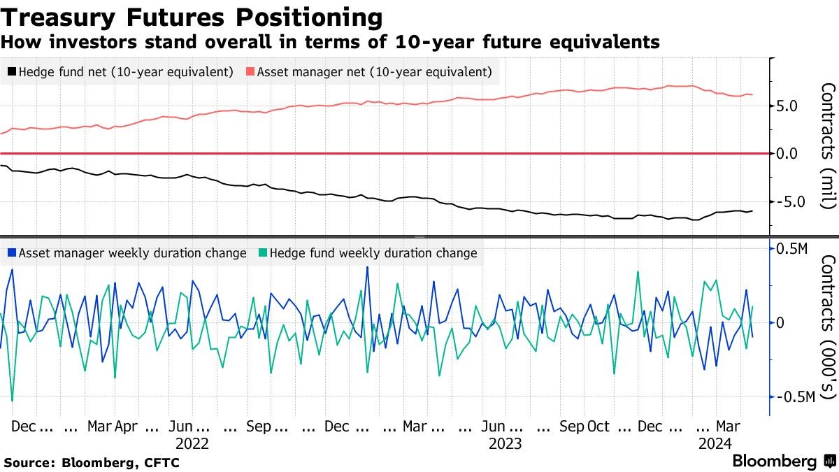 儘管摩根大通的調查顯示近期出現了一些追崇逢低買入策略的買盤勢力,但美國商品期貨交易委員會 (CFTC) 等其他統計數據顯示並非如此。自 2 月初以來,CFTC 的統計數據顯示,過去 10 週中,資產管理公司有 8 周美債淨多頭頭寸減少,包括截至 4 月 9 日的最近一週數據。