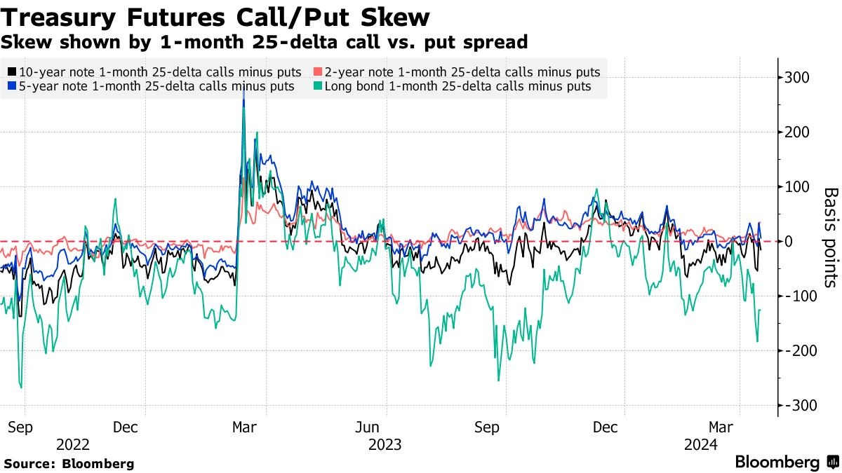 儘管在上週五美債出現極其短暫的避險買盤,但對沖長期美債拋售的成本仍居高不下,尤其是與短期和中期國債期貨相比。期權市場近期的資金流動傾向於對沖更大規模的拋售,其中表現突出的交易包括週一以 440 萬美元押注 10 年期國債收益率為 4.65% 的高額交易。週二的交易亮點包括 1,800 萬美元的大宗期權出售交易,顯示在 10 年期收益率觸及年度新高水平之際,空頭倉位出現明顯的獲利了結信號。