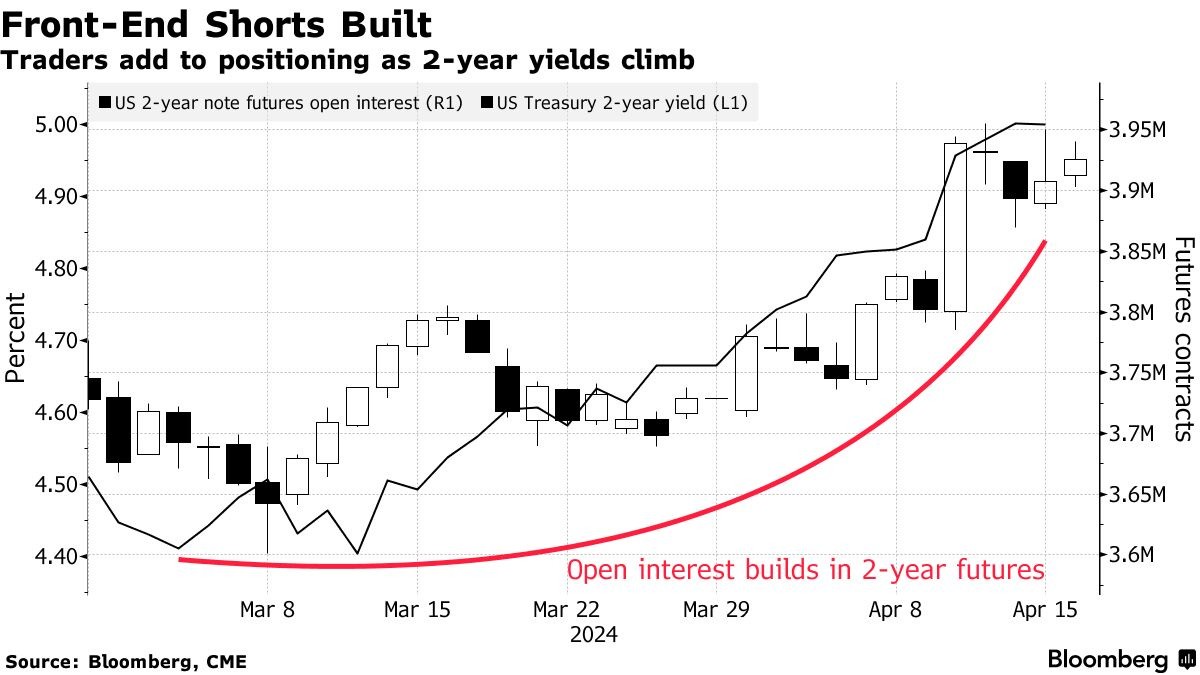 美國國債交易市場持續的負面情緒基調可以從 2 年期美國國債期貨看跌未平倉倉位累積的規模看出。隨着收益率持續攀升,過去 14 個交易日中有 13 個交易日明顯出現新倉位,而非平倉。