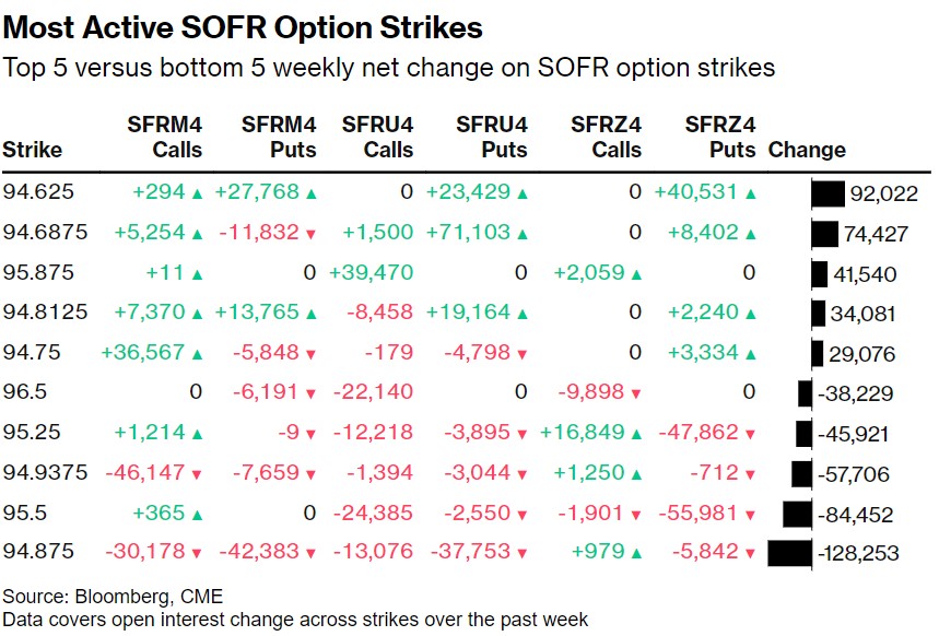 在 SFRZ4 95.0625/94.875/94.6875 看跌期權樹的買盤活動之後,94.6875 的流動也非常活躍,這一類樹形期權通常涉及多個期權的買入和賣出,構成一個更復雜的期權結構,旨在利用不同的波動率和價格水平,允許交易員們在多個潛在的市場轉折點上設立保護措施或利潤目標。在包括 SFRU4 94.875/94.75 看跌價差買家在內的資金流動之後,94.875 的行權 SOFR 出現了本週最嚴重的清算。看跌價差通常用於對沖風險或投機利率下降,這種策略的運用顯示出市場可能對利率預期進一步上升持謹慎態度,尤其是在這個特定的行權價格水平。