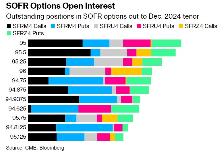 在 2025 年 6 月的 95.50 點位看漲期權行權點位中也出現了大量的未平倉合約,這是數量第二多的行權點位。在其他 SOFR 期權中,2024 年 6 月份的 94.75、94.875 和 94.9375 行權區間仍有相當數量的未平倉看跌期權。