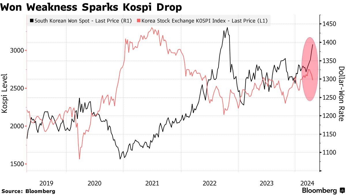 近日,利率期貨市場對於美聯儲的降息押注一度低至僅 25 個基點,與年初的 150 個基點預期以及上週 CPI 公佈前的 75 個基點相差甚遠,並且市場押注首次降息時機從年度的一度押注 3 月大幅推遲至 11 月。在降息押注大面積退潮的背景之下,各期限的美債收益率不斷上升,刺激美元兑幾乎所有國家貨幣的匯率大幅上行,其中韓元兑美元自上週以來貶值超 3%。