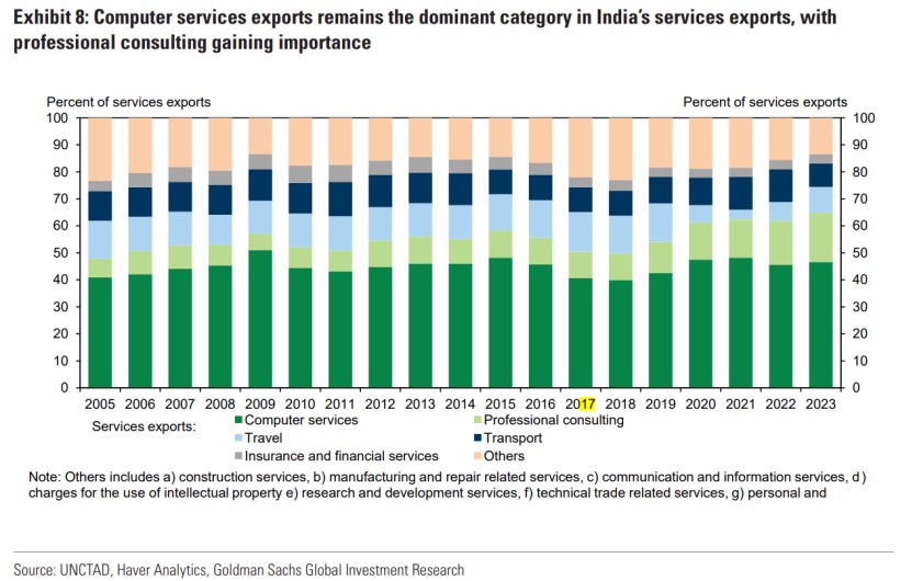 高盛指出,自 2005 年以來,印度服務出口以接近 11% 的年複合增長率增長,遠超全球增速,特別是在計算機和專業諮詢服務方面。到 2023 年,印度在全球服務出口中的份額從不足 2% 增至 4.6%。