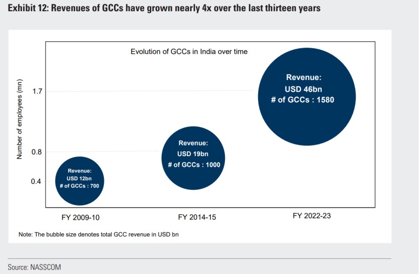 高盛統計數據顯示,截至 2023 財年,印度 GCC 總收入較十三年前激增 4 倍,達到 460 億美元,提供了 170 萬個就業崗位。