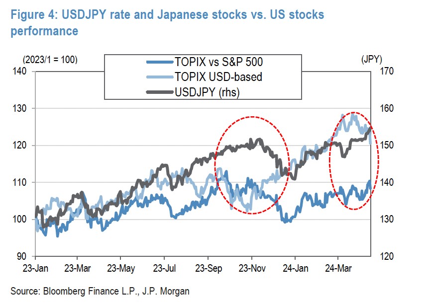 但摩根士丹利強調,當日元匯率跌破 152 時,日本股市開始跑輸美國股市,可能會對日本股市產生負面影響。過度日元疲軟對股市造成下列三大不利影響:一是對實體經濟 (即消費支出) 的影響;二是加劇企業與家庭、出口企業與內需企業之間的差距,對中小企業尤為不利;第三則是海外投資者回報率下降。