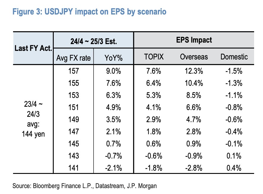 但摩根士丹利再報告中強調,如果日元貶值超過美元兑日元匯率 152,可能會轉變為日本股市的負面因素,如果美元兑日元匯率超過 157,日元貶值帶來的進口價格上漲可能完全抵消的實際工資增長。